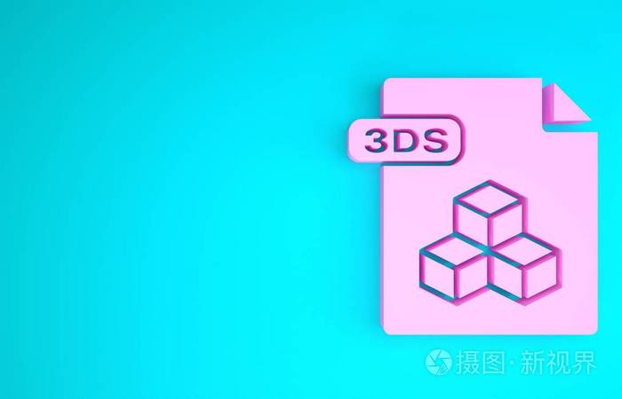 粉红色3DS文件文档。下载3ds按钮图标隔离在蓝色背景上。3DS文件符号